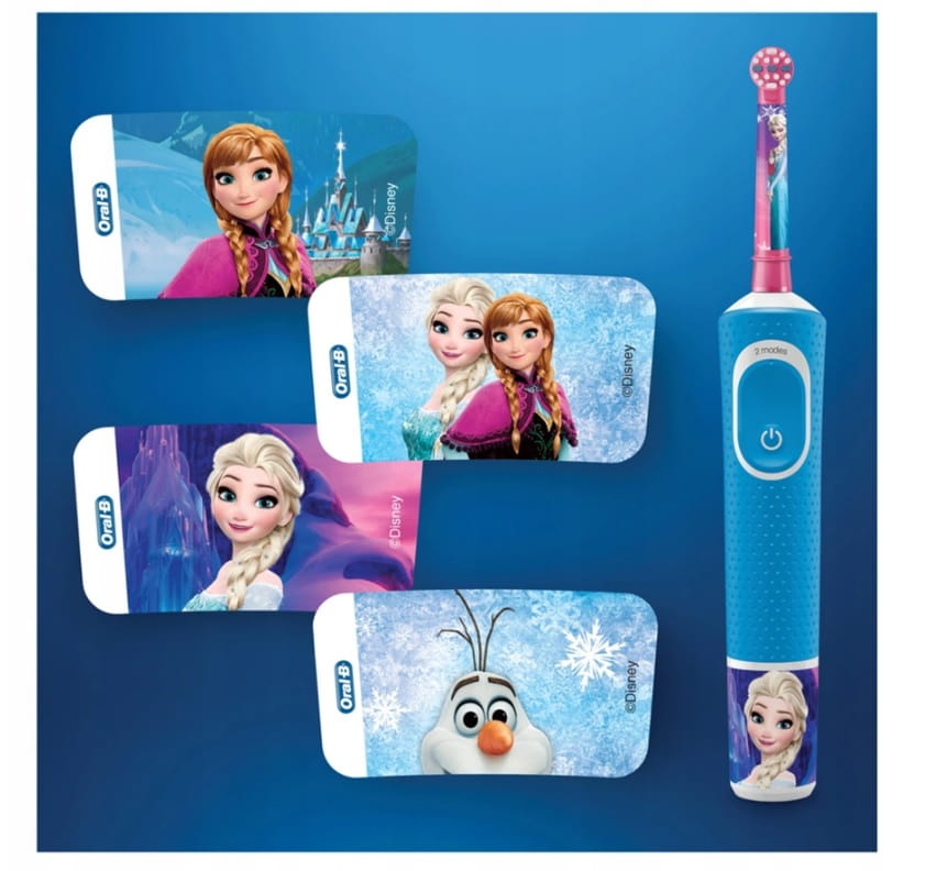 - W zestawie, ze szczoteczką elektryczną Oral-B Vitality Kids FROZEN dostępne są kolorowe naklejki na szczoteczkę z bohaterami z bajki Kraina Lodu. Dziecko przy pomocy nalepek może spersonalizować swoją szczoteczkę, która stanie się wyjątkowa. Bohaterowie najpopularniejszych bajek Disneya zapewniają wesołą zabawę i zachęcają dzieci do regularnego mycia zębów.