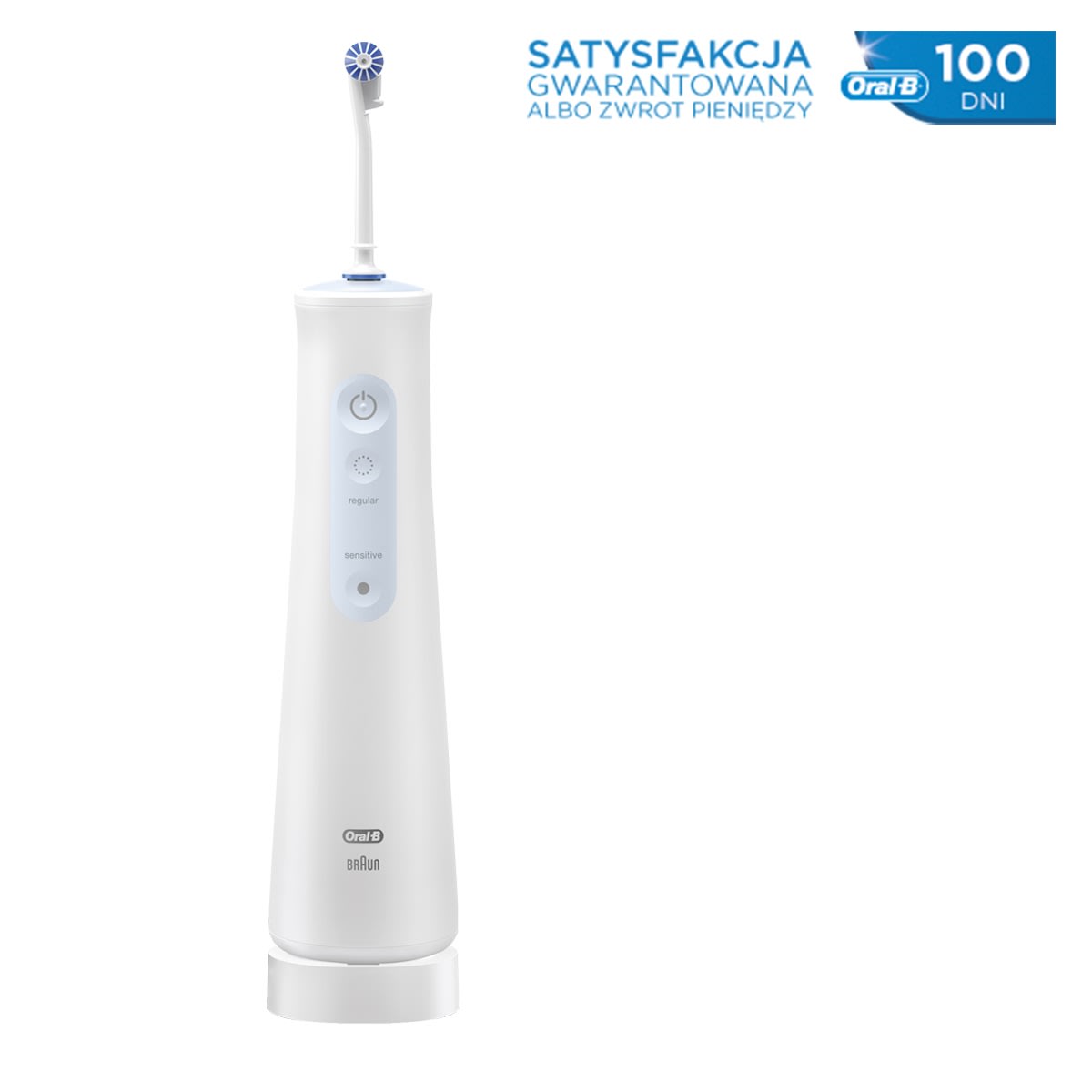 - 2 poziomy intensywności: możliwość wyboru zwykłego lub delikatnego ciśnienia wody podczas mycia zębów