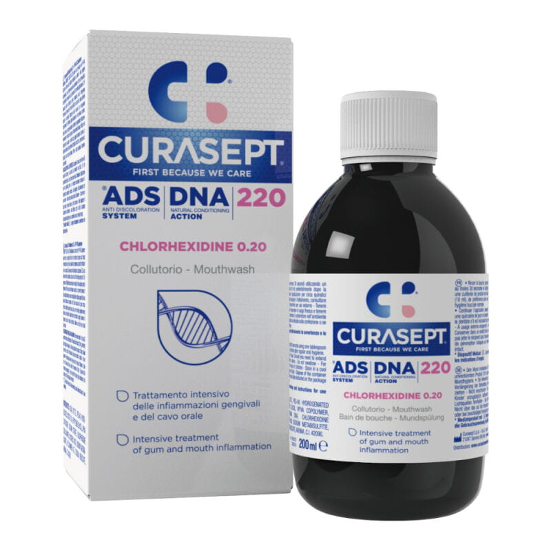 Płyn z chlorheksydyną Curasept ADS DNA przeznaczony jest do kuracji intensywnej. Zawiera 0,20% chlorheksydyny, dzięki czemu silnie hamuje tworzenie się płytki nazębnej. Polecany jest do stosowania przed i po zabiegach chirurgicznych, zapobiega komplikacjom pooperacyjnym, szczególnie przy utrudnionej pielęgnacji mechanicznej jamy ustnej.