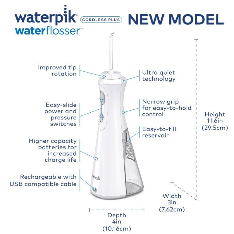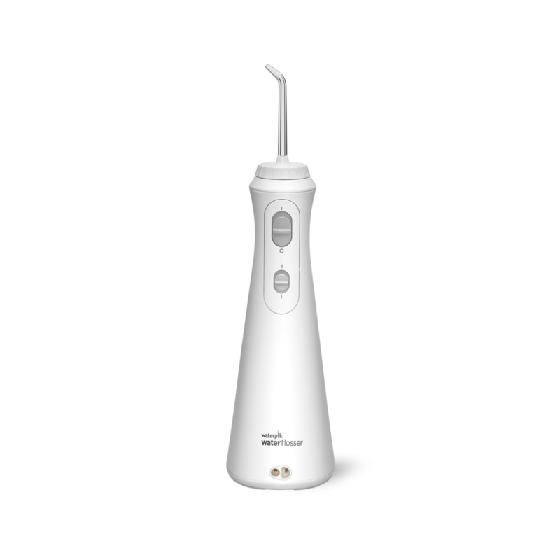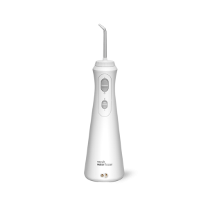 Waterpik WP-490 Cordless Plus ultra cichy ładowany, przenośny irygator idealny do użytku w mniejszych łazienkach lub w podróży. Posiada ergonomiczny wąski uchwyt.
