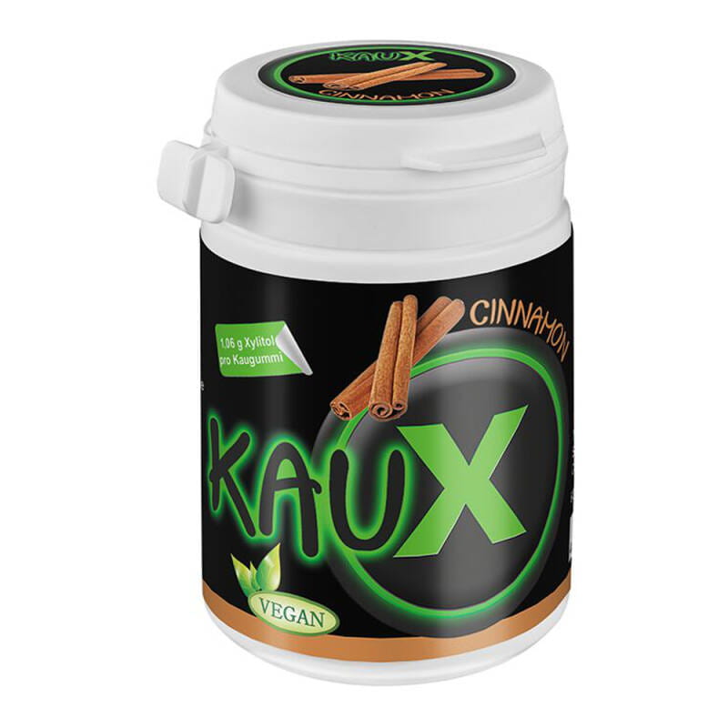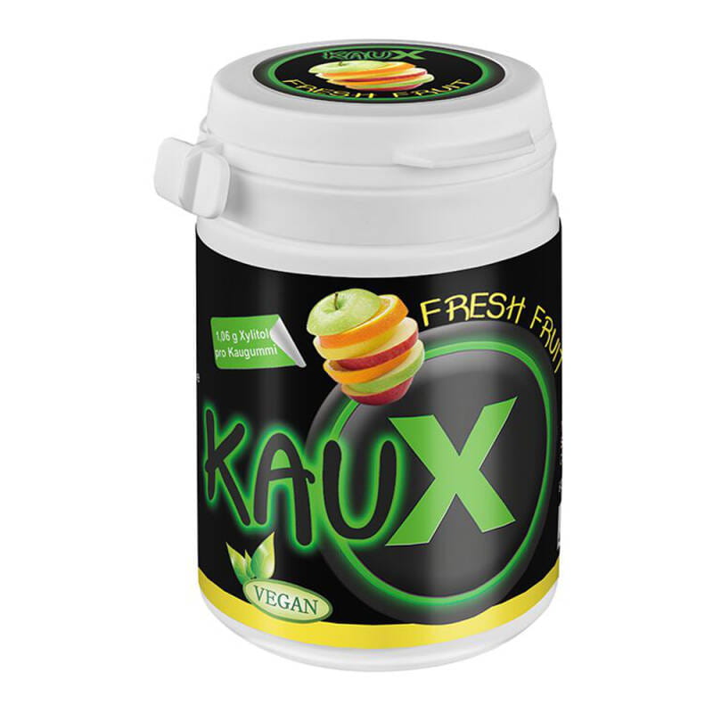 KAUX to przeciwpróchnicowe gumy do żucia z ksylitolem. Ksylitol jest naturalnym substytutem cukru występującym w wielu owocach i warzywach. Ksylitol hamuje wyrównuje pH w jamie ustnej po posiłkach hamując rozwój bakterii, które wywołują próchnicę. Żucie gumy z ksylitolem KAUX zapobiega powstawaniu powstawaniu płytki nazębnej będącej główną przyczyną próchnicy, zapalenia dziąseł, nieświeżego oddechu oraz stymuluje procesy remineralizacji szkliwa. Guma do żucia KAUX słodzona jest w 100% ksylitolem i nie zawiera aspartamu.