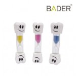 Kolorowe zegary piaskowe z plastikowymi końcówkami w kształcie uśmiechniętego zęba trzonowego.