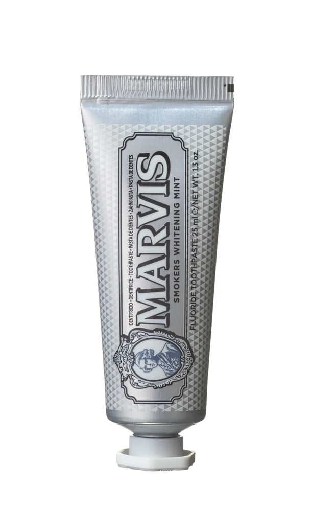Wybielająca pasta do zębów MARVIS dla palaczy usuwa powierzchniowe przebarwienia zębów spowodowane paleniem lub spożywaniem pokarmów bogatych w pigmenty. Skutecznie czyści zęby i chroni je przed próchnicą.