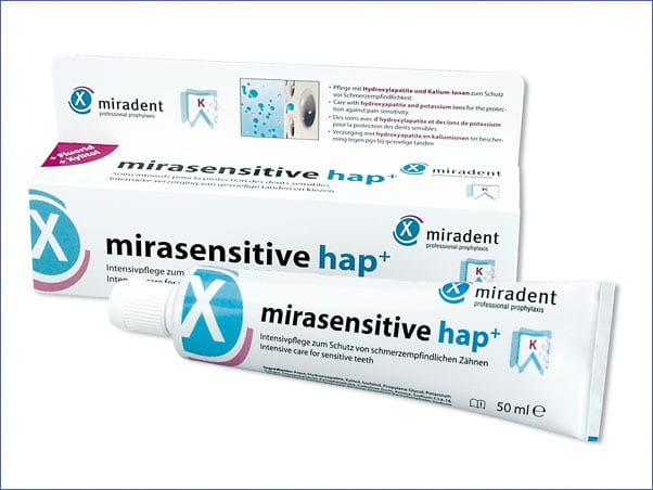 Pasta Mirasensitive hap+ (z podwójnym kompleksem) pomaga i natychmiast łagodzi reakcje bólowe. Dzięki cytrynianowi potasu dochodzi do uwolnienia jonów potasu a następnie do wnikania ich poprzez otwarte kanaliki zębiny do wnętrza zęba i bezpośredniej ochrony unerwienia.