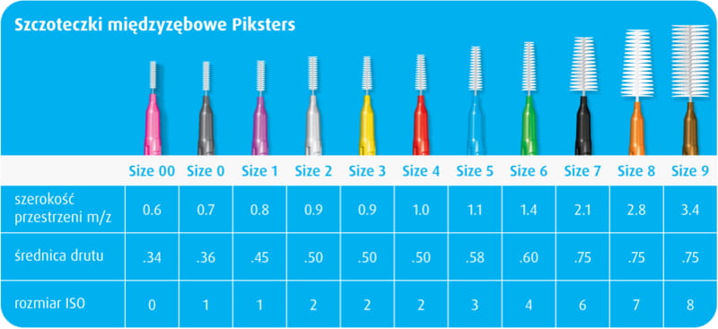 - Przed przystąpieniem do czyszczenie szczoteczkami międzyzębowymi Piksters należy wybrać odpowiedni ich rozmiarach, tj taki, który umożliwi nam umiejscowienie szczoteczki w przestrzeni bez użycia siły.
