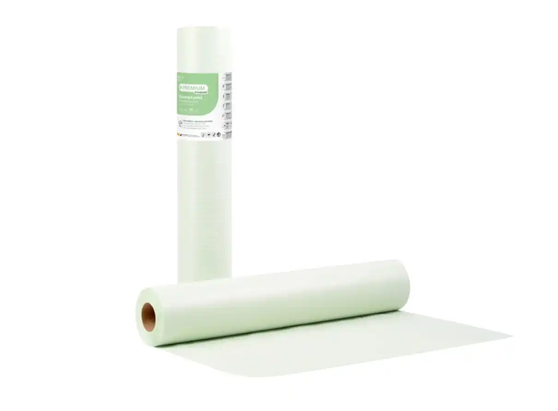 Jednorazowy podfoliowany podkład w rolce, medyczny. Wykonany z dwuwarstwowego laminatu pulpy celulozowej i HDPE.