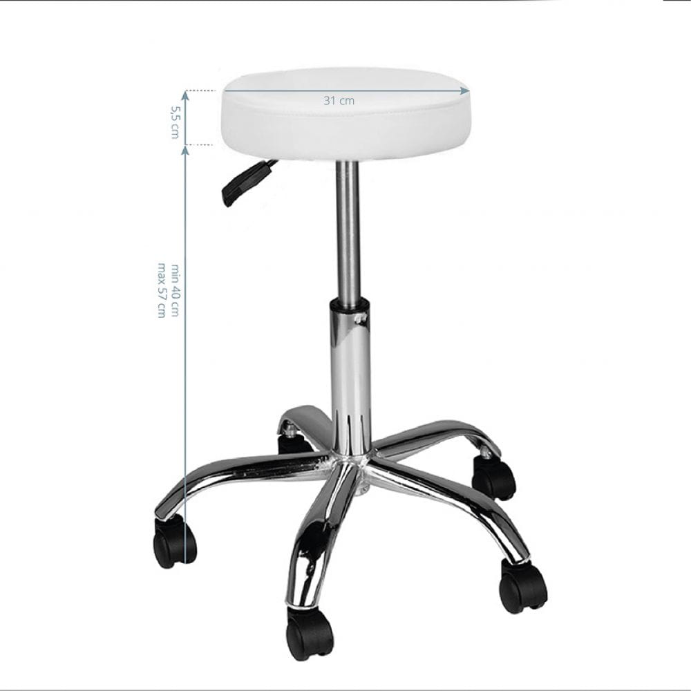 Wygodny taboret, stabilny na pięcioramiennej podstawie, z gumowanymi kółkami, bez oparcia, w kolorze białym.