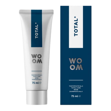 Pasta do zębów WOOM TOTAL + posiada składniki o szerokim działaniu, dzięki czemu pasta doskonale wzmacnia zęby odbudowując strukturę szkliwa, łagodzi ból związany z nadwrażliwością zębową, ogranicza rozwój bakterii zmniejszając ryzyko próchnicy, demineralizacji szkliwa a także redukuje zalegającą płytkę nazębną chroniąc przed powstaniem kamienia nazębnego. WOOM TOTAL + to wyjątkowa pasta do zębów o kompleksowym działu, polecana do codziennego stosowania. Pozostawia uczucie doskonale czystych zębów.