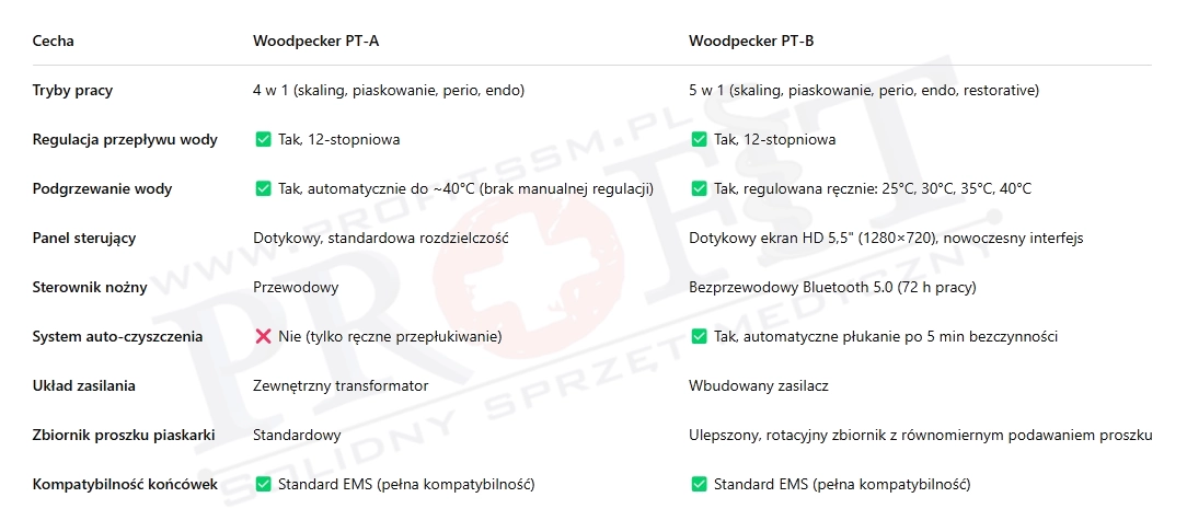 Woodpecker PT-B to zaawansowane urządzenie, które łączy w sobie skalowanie ultradźwiękowe i piaskowanie powietrzne, oferując kompleksowe rozwiązanie do profilaktyki stomatologicznej. Jego wszechstronność, precyzja i komfort użytkowania czynią go doskonałym wyborem dla nowoczesnych praktyk stomatologicznych.
